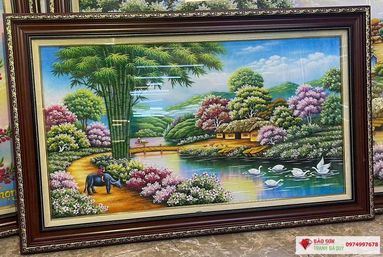 Bức tranh đá quý tái hiện lại phong cảnh làng quê. Với những hình ảnh quen thuộc như cây tre, cậu bé chăn trâu thổi sáo,… Làng quê vừa mộc mạc, giản dị lại vừa thể hiện vẻ đẹp thơ mộng, yên bình. Những hình ảnh này gợi nhớ cho chúng ta nỗi nhớ nhung mam mác không thể phai nhòa trong tâm thức mỗi người chúng ta.